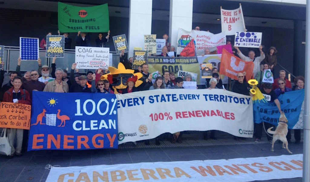 Community members have gathered at the National Convention Centre this morning, the location of a highly anticipated COAG Energy Council meeting, to call on state and federal ministers to stand up to fossil fuel bullies and grow renewables.