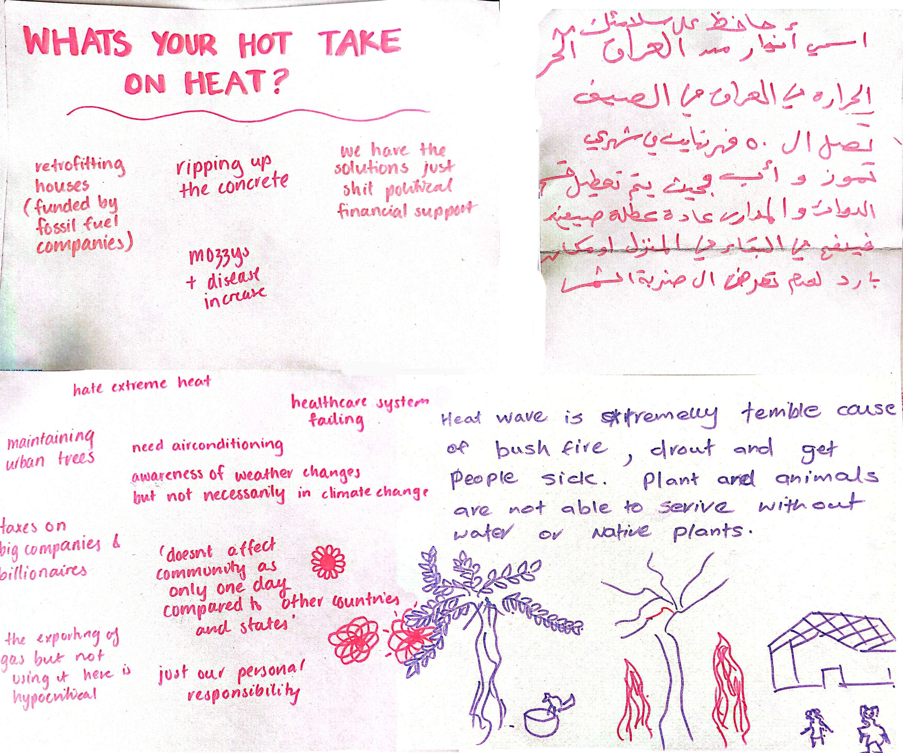 People we talked to brought up solutions such as retrofitting houses (funded by fossil fuel companies), and ripping up concrete in urban areas while planting more street trees and green spaces.