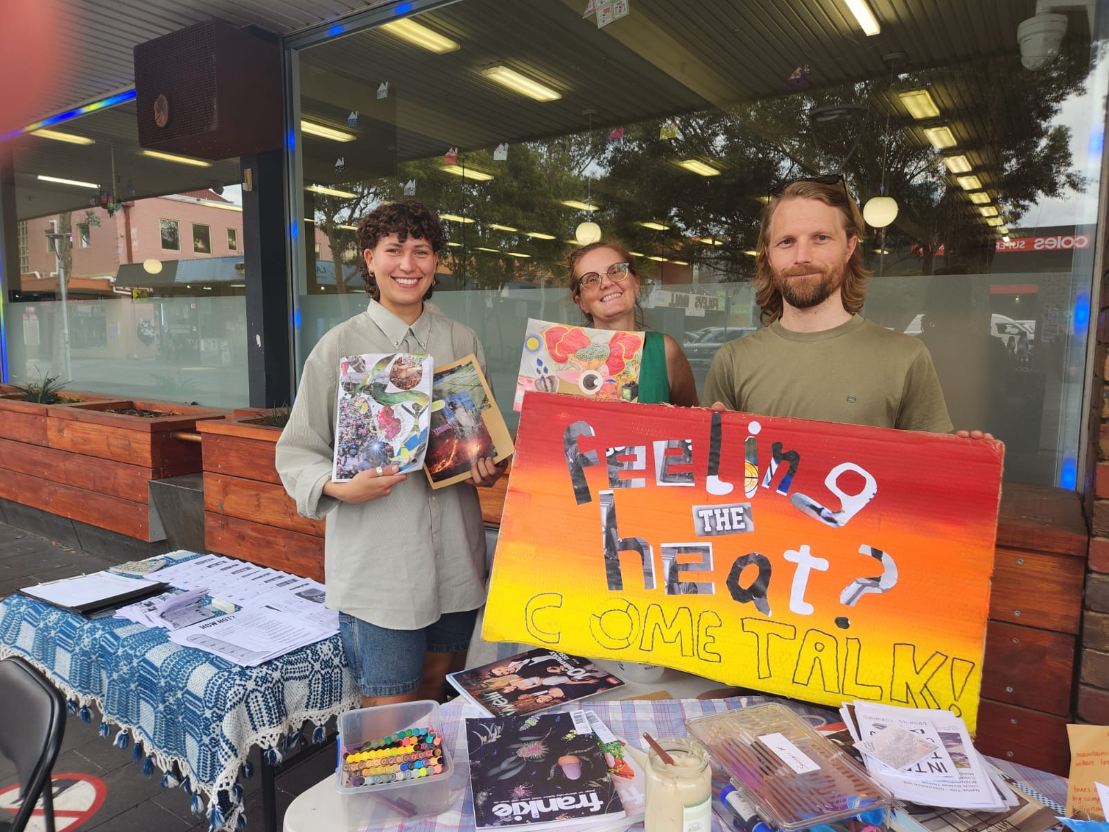 After the market, we packed up and moved to a shaded spot outside the Coburg Library. Here we talked to passersby, asking them for their 'hot take on heat', and again inviting people to make a collage or drawing, or to take some information about heatwaves and how to stay safe in them.