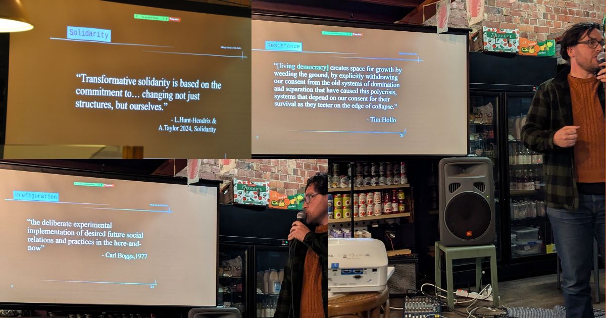 Our second speaker, Jade Ambrose works on RAD Housing (a project to retrofit and decommodify suburban housing) and Merri-bek Tech (a project to build out sustainable and climate-ready local digital services). They shared an inspirational presentation on this work and the value of marrying internal and external growth in order to have the momentum needed to adapt to the climate crisis.