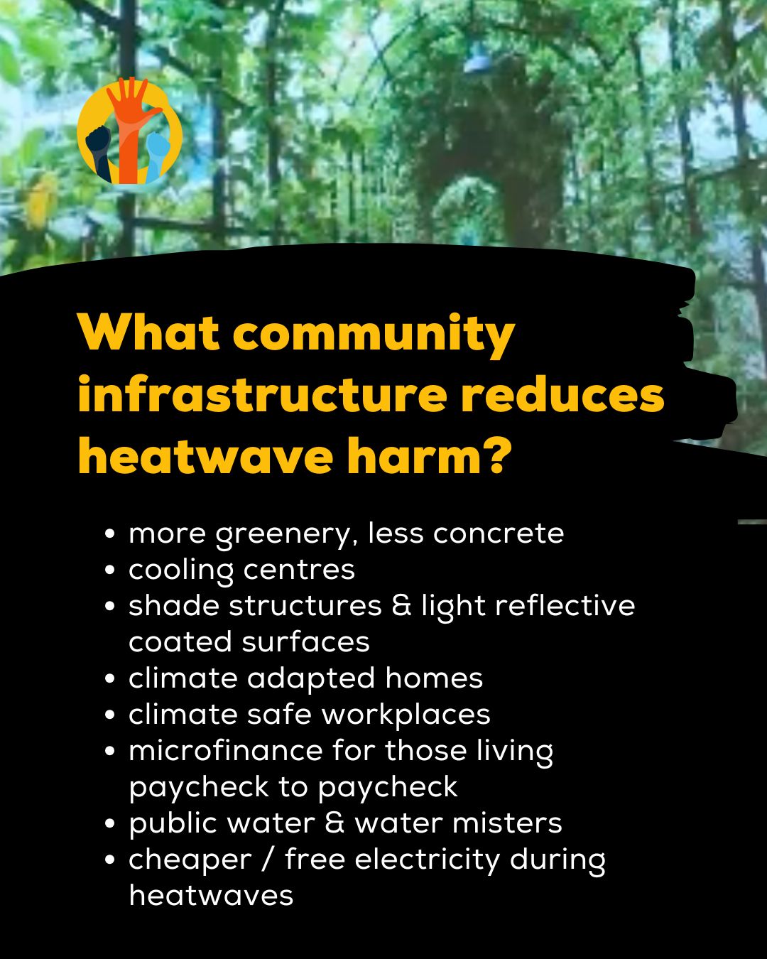 We can create or advocate for community infrastructure that will reduce heatwave severity and deaths in our communities. This includes: