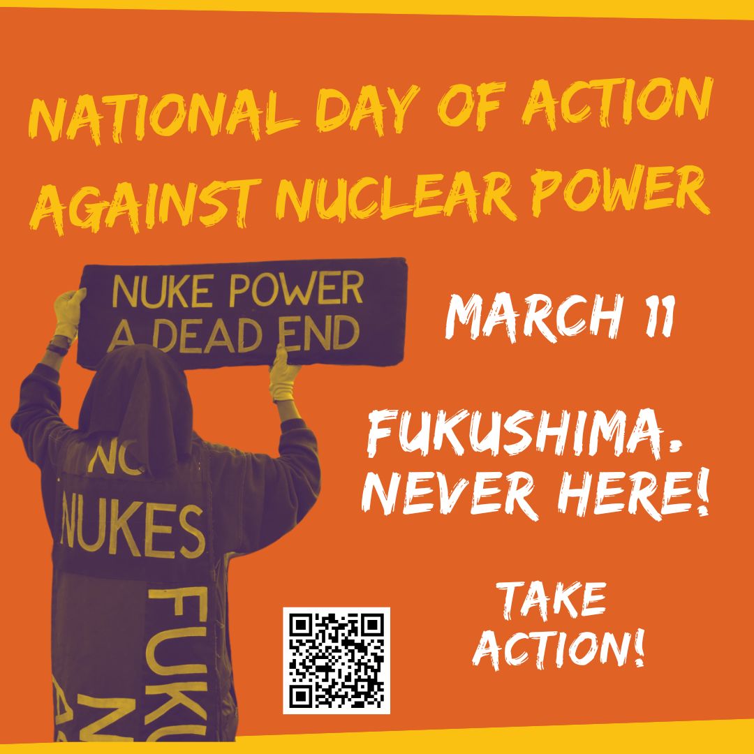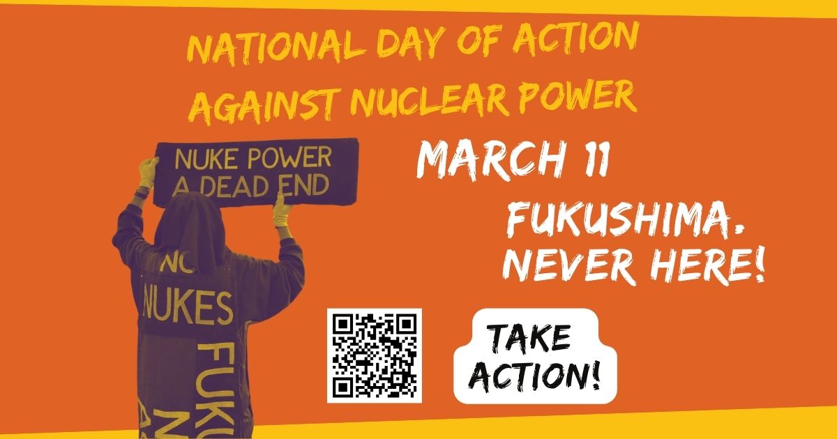 March 11 is going to be a National Day of Action against nuclear power. We invite everyone to take action on or around that day, however big or small. It could be organising an event, rally, theatrical action, webinar, or writing a letter to your local newspaper, posting on social media, putting a sticker on a community notice board or talking about nuclear with someone in your community. Please share your event with us and take lots of photos or a short video so we can promote it. To attend an existing event, have a look at what's on near you.