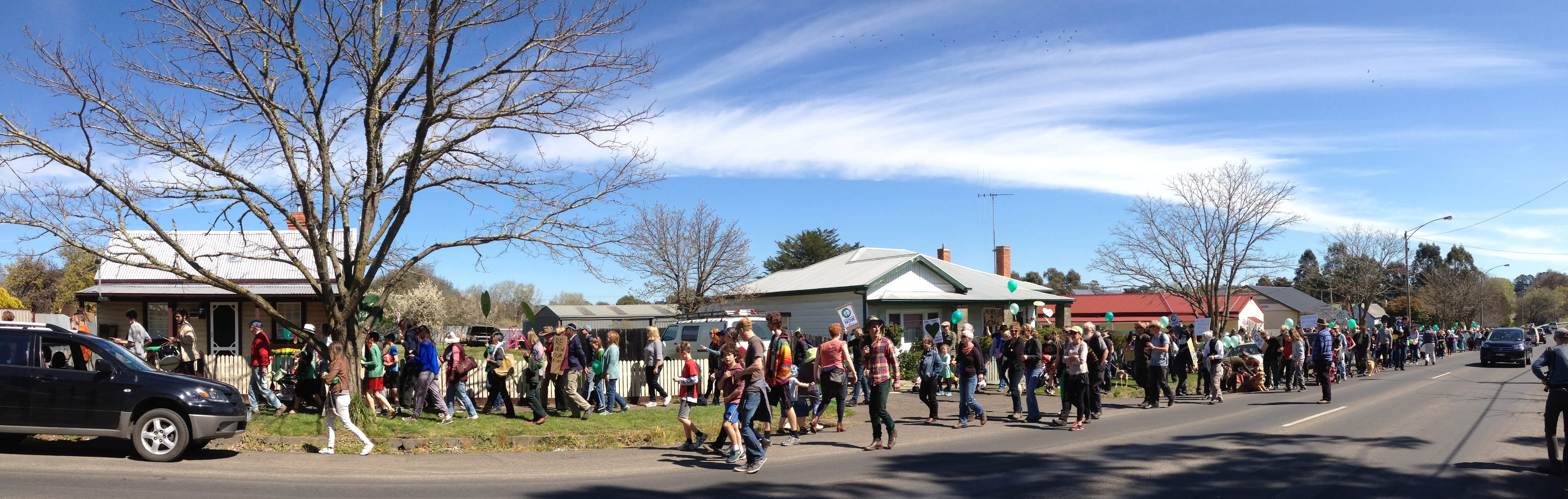 So far in 2014, we’ve presented at the Woodend Sustainable Living Festival, published an open letter to the Macedon candidates, and hosted a film night. We have also held a demonstration near Woodend on the anniversary of the Coalition’s anti-wind farm laws and participated in the People’s Climate March in Kyneton.