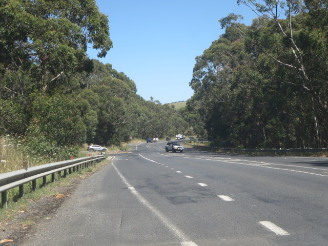 The South Gippsland Highway coming into Meeniyan from the east. 3 koalas were killed near this location in February 2023. Preferred koala feed trees are located near the road. The road also crosses the Southern Rail Trail.