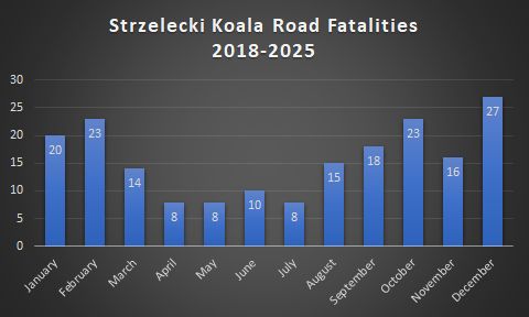 8 deaths recorded over a 7km section of the South Gippsland Highway (including 3km east of Koonwarra). 1 death in 2021, 1 death in 2022, 1 death in 2023 and 5 deaths in 2024. A koala death every 1.4km of this section of road over the 6 year period, averaging 2 deaths per year since April 2021. Riskiest months: February (2) and May (2).