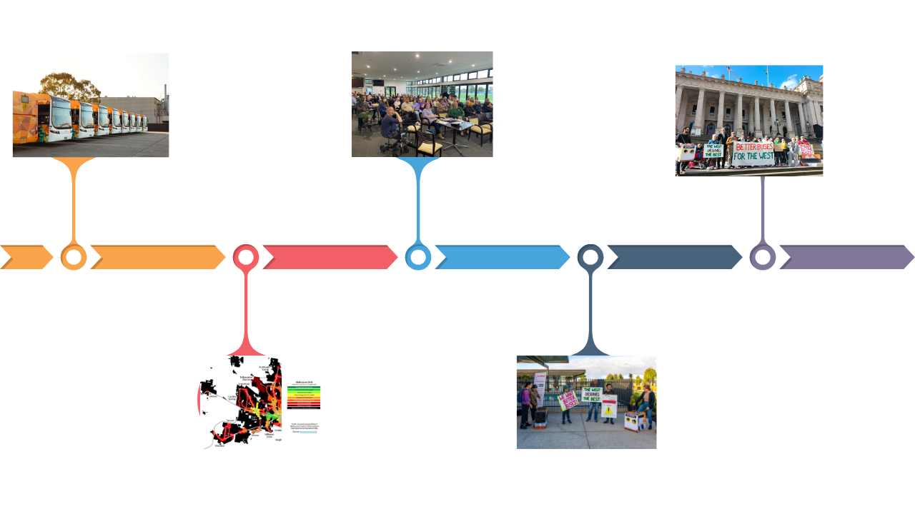 - The Age writes an article on the lack of public transport in the West, and the toll it’s taken on local residents. The article features a picture from our Bus Marathon, organised alongside Point Cook Action Group in 2023!
