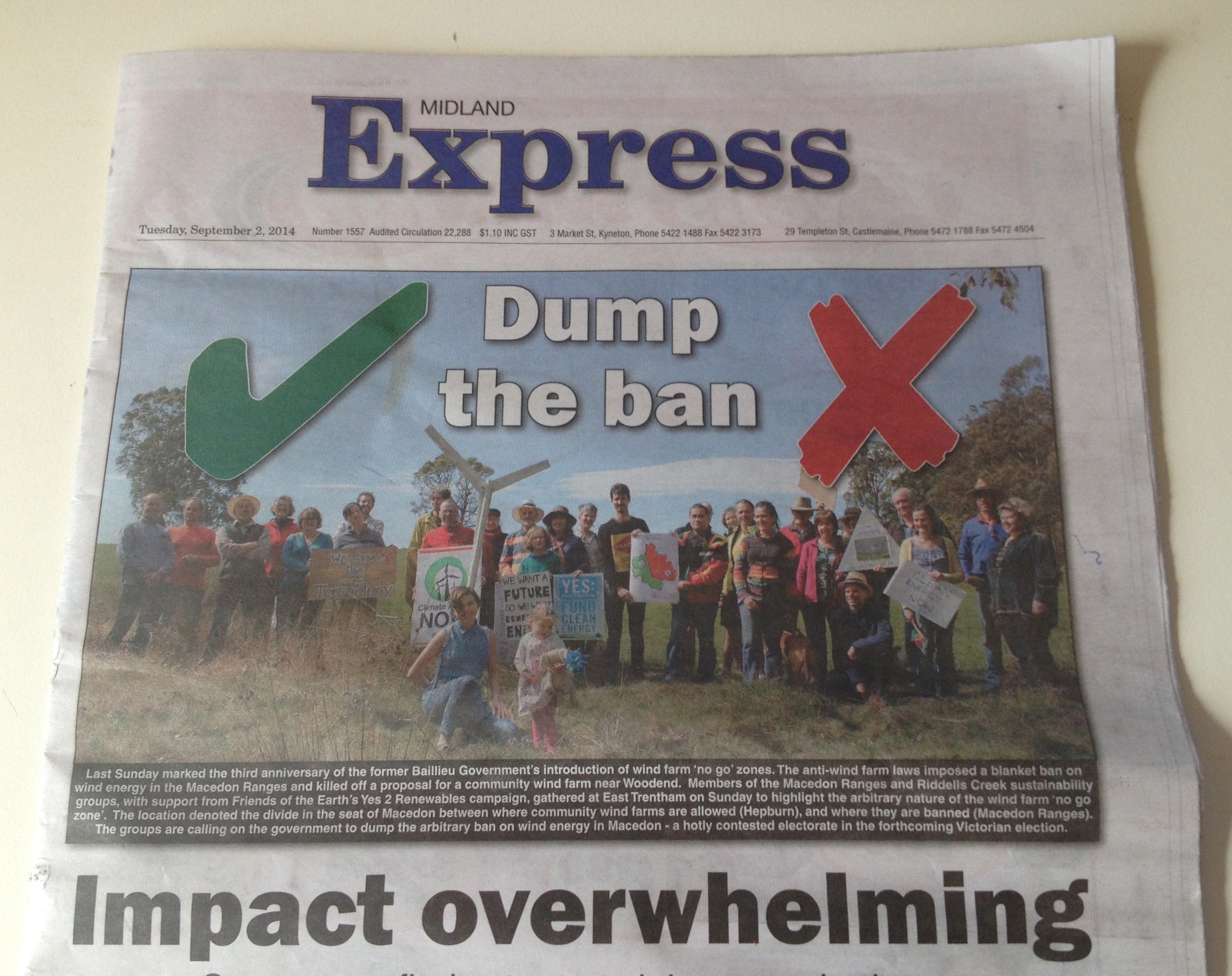 I am in the photo that appeared on the front page of (Macedon Ranges Guardian sister paper) TheMidland Express this week, calling for an end to the ban on wind turbines in the Macedon Ranges (and elsewhere in Victoria).