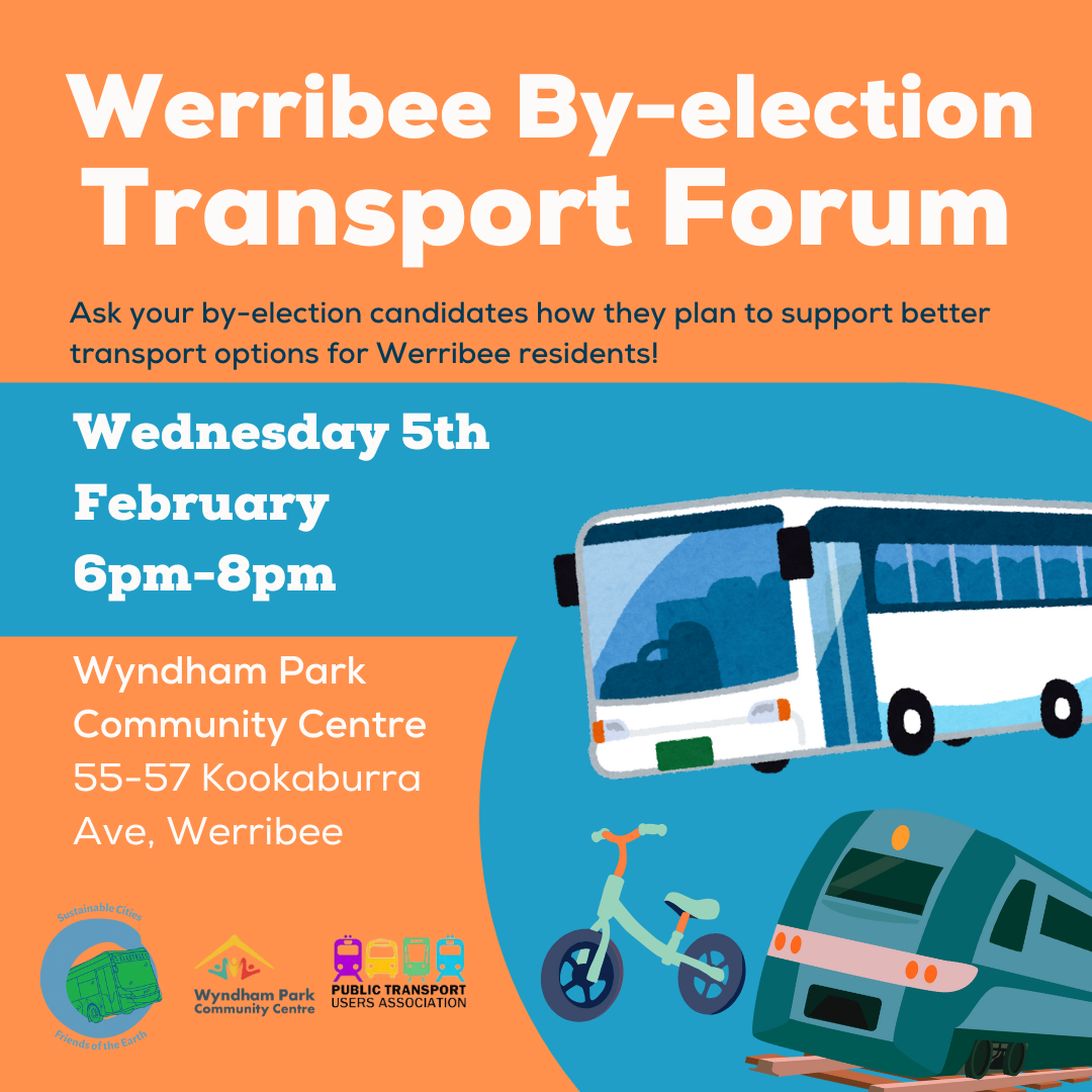 Join us on Wednesday 5th February, 6pm-8pm, at Wyndham Park Community Centre, to ask candidates for the Werribee by-election what they are going to do to fix our broken public transport system if elected.